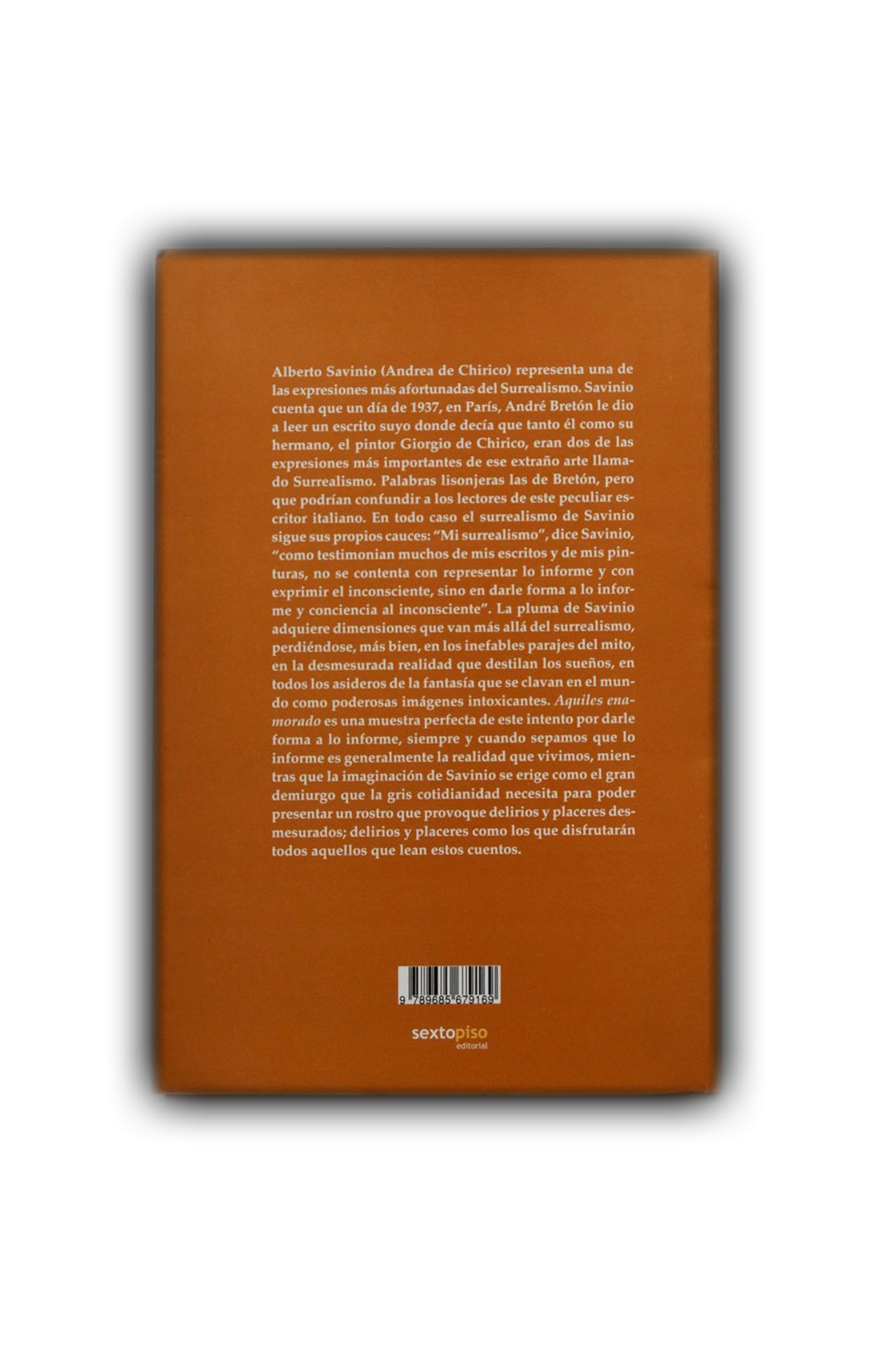 Representa una de las expresiones más afortunadas del Surrealismo. Savinio cuenta que un día de 1937, en París, André Bretón le dio a leer un escrito suyo donde decía que tanto él como su hermano, el pintor Giorgio de Chirico, eran dos de las expresiones más importantes de ese extraño arte llamado Surrealismo. Palabras lisonjeras las de Bretón, pero que podrían confundir a los lectores de este peculiar escritor italiano. En todo caso el surrealismo de Savinio sigue sus propios cauces: "Mi surrealismo", dice Savinio, "como testimonian muchos de mis escritos y de mis pinturas, no se contenta con representar lo informe y con exprimir el inconsciente, sino en darle forma a lo informe y conciencia al inconsciente". La pluma de Savinio adquiere dimensiones que van más allá del surrealismo, perdiéndose, más bien, en los inefables parajes del mito, en la desmesurada realidad que destilan los sueños, en todos los asideros de la fantasía que se clavan en el mundo como poderosas imágenes intoxicantes. 'Aquiles enamorado' es una muestra perfecta de este intento por darle forma a lo informe, siempre y cuando sepamos que lo informe es generalmente la realidad que vivimos, mientras que la imaginación de Savinio se erige como el gran demiurgo que la gris cotidianidad necesita para poder presentar un rostro que provoque delirios y placeres desmesurados; delirios y placeres como los que disfrutarán todos aquellos que lean estos cuentos.