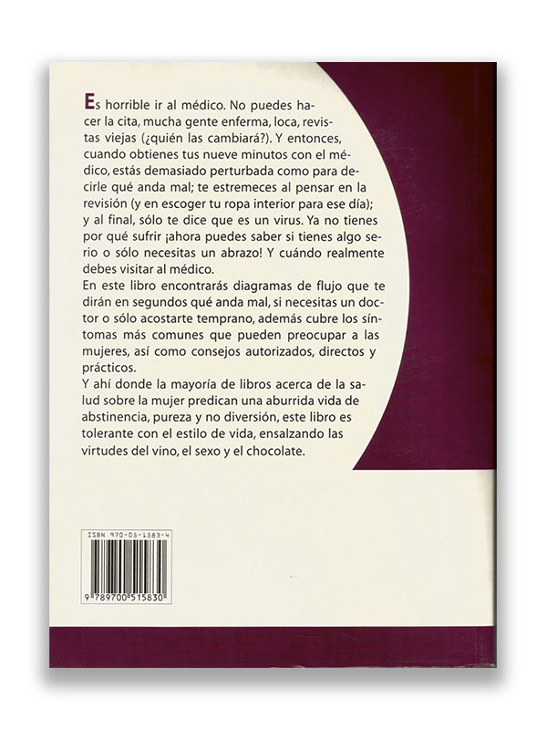 Este libro te ayudará a saber por ti misma si tus padecimientos de salud ameritan un médico o si nada más estás necesitando del abrazo de un ser querido. Con diagramas sencillos la autora te ayuda a decirte en segundos qué anda mal. Donde la mayoría de libros acerca de la salud de la mujer predican una aburrida vida de abstinencia, pureza y no diversión, este libro es tolerante con el estilo de vida, ensalzando las virtudes del vino, el sexo y el chocolate. ¡A disfrutar de tu lectura!