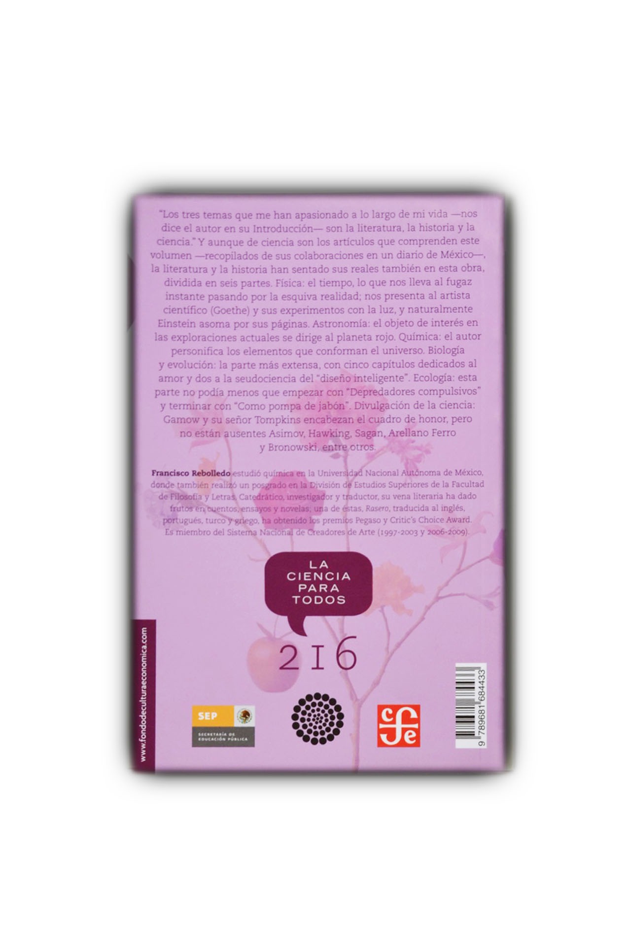 El libro está conformado por una recopilación de artículos amenos e interesantes de los temas más variados en torno a diversas cuestiones científicas. Algunos de los textos tienen que ver con sucesos recientes como el huracán Katrina que asoló al Caribe y a Estados Unidos en 2006, otros abordan alguna enfermedad y otros más simplemente por el placer de tratar determinado asunto. El contenido está agrupado en seis grandes temas: física, astronomía, química, biología y evolución, ecología y divulgación de la ciencia. En esta obra, Francisco Rebolledo trata varios temas. Física: el tiempo, lo que nos lleva al fugaz instante pasando por la esquiva realidad; nos presenta al artista científico (Goethe) y sus experimentos con la luz, y naturalmente Einstein asoma por sus páginas. Astronomía: el objeto de interés en las exploraciones actuales se dirige al planeta rojo. Química: el autor personifica los elementos que conforman el universo. Biología y evolución: la parte más extensa, con cinco capítulos dedicados al amor y dos a la seudociencia del “diseño inteligente”. Ecología: esta parte no podía menos que empezar con “Depredadores compulsivos” y terminar con “Como pompa de jabón”. Divulgación de la ciencia: Gamow y su señor Tompkins encabezan el cuadro de honor, pero no están ausentes Asimov, Hawking, Sagan, Arellano Ferro y Bronowski, entre otros.