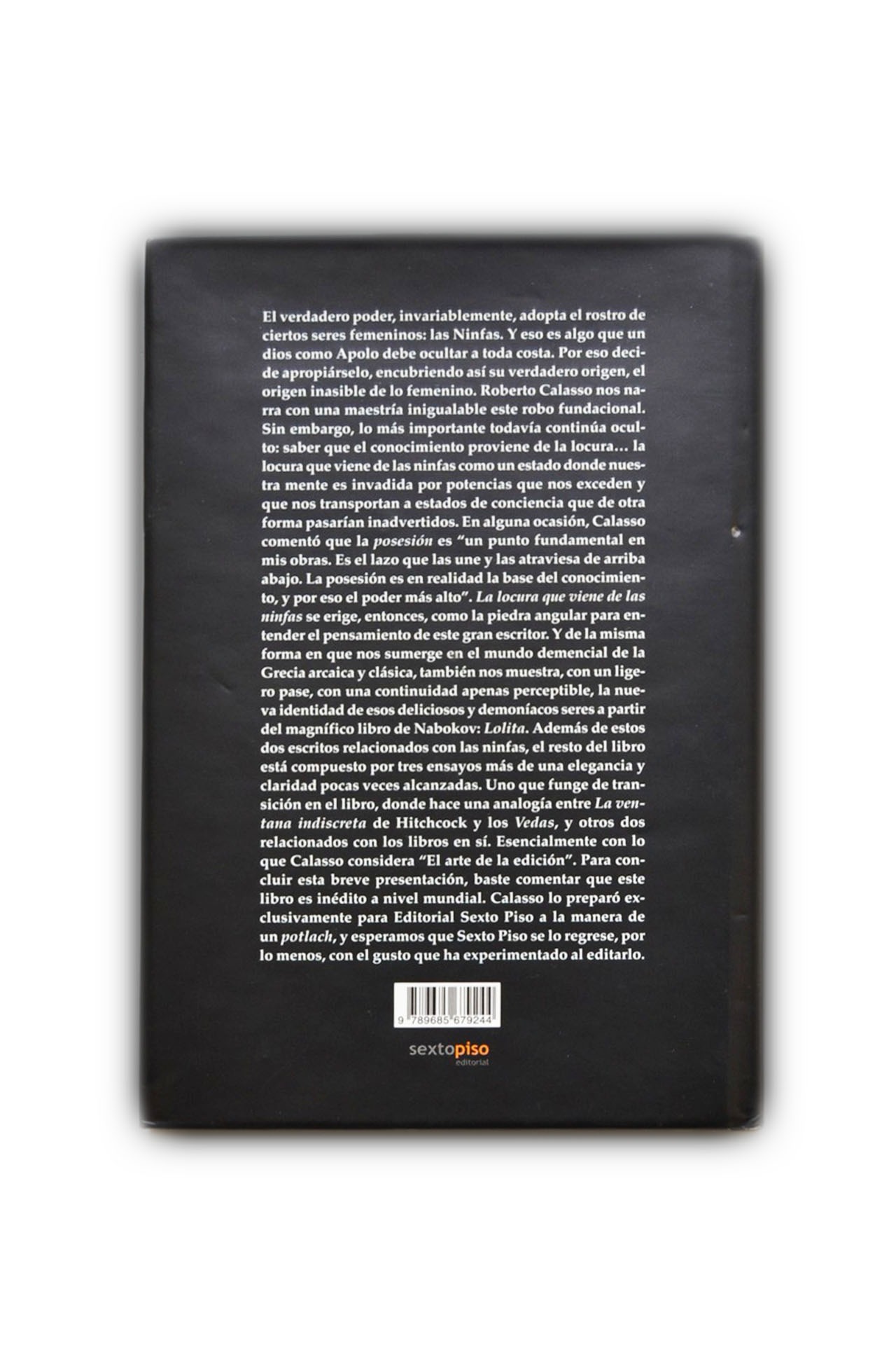 El verdadero poder, invariablemente, adopta el rostro de ciertos seres femeninos: las Ninfas. Y eso es algo que un dios como Apolo debe ocultar a toda costa. Por eso decide apropiárselo, encubriendo así su verdadero origen, el origen inasible de lo femenino. Roberto Calasso nos narra con una maestría inigualable este robo fundacional. Sin embargo, lo más importante todavía continúa oculto: saber que el conocimiento proviene de la locura... la locura que viene de las ninfas como un estado donde nuestra mente es invadida por potencias que nos exceden y que nos transportan a estados de conciencia que de otra forma pasarían inadvertidos. En alguna ocasión, Calasso comentó que la posesión es ?un punto fundamental en mis obras. Es el lazo que las une y las atraviesa de arriba abajo. La posesión es en realidad la base del conocimiento, y por eso el poder más alto?. Y de la misma forma en que nos sumerge en el mundo demencial de la Grecia arcaica y clásica, también nos muestra, con un ligero pase, con una continuidad apenas perceptible, la nueva identidad de esos deliciosos y demoníacos seres a partir del magnífico libro de Nabokov: Lolita. Además de estos dos escritos relacionados con las ninfas, el resto del libro está compuesto por tres ensayos más de una elegancia y claridad pocas veces alcanzadas. Uno que funge de transición en el libro, donde hace una analogía entre La ventana indiscreta de Hitchcock y los Vedas, y otros dos relacionados con los libros en sí.