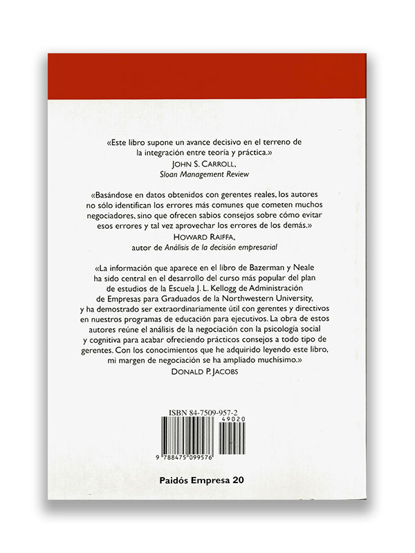 A partir de diez mil estudios sobre conducta en la negociación realizados con otros tantos ejecutivos y estudiantes en los últimos cinco años, Max H. Bazerman y Margaret A. Neale llegan a la inquietante conclusión de que la mayoría de los gerentes tienden a comportarse de modo irracional en las negociaciones. Por ejemplo, descubrieron que son proclives a experimentar una excesiva confianza en sí mismos, a intensificar precipitadamente sus compromisos iniciales y desatender las técnicas que emplea la otra parte. Esta conducta -según demuestran los autores- es el resultado directo del hecho de que somos víctimas de nuestras propias falsas y engañosas suposiciones. Por medio de simulaciones y ejercicios, Bazerman y Neale enseñan a evitar las trampas centrando la atención en la conducta del oponente y desarrollando la aptitud de reconocer las propias limitaciones y tendencias distorsionadoras. Por medio de consejos expuestos paso a paso y casos tomados de la vida real -como por ejemplo el desastroso programa para viajeros ocasionales que ha costado más de doce millones de dólares a la industria norteamericana del aerotransporte en concepto de viajes gratuitos, o las igualmente catastróficas rebajas de promoción que casi destruyen a Chrysler, Ford y General Motors-, los autores enseñan así a los gerentes a evaluar y negociar incluso en las situaciones más difíciles. El objetivo del libro de esta manera, es guiar al lector desde las más simples negociaciones bilaterales hasta las más complejas celebradas entre varias partes, y sobre todo ayudar a los gerentes más reflexivos a desarrollar las mejores habilidades para la negociación.