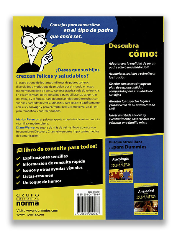 El reto de educar a los hijos en un hogar monoparental no es nada fácil, pero este fenómeno es cada día más común en nuestra sociedad. Tanto si es una decisión tomada voluntariamente, como si ha llegado a esta situación a causa de una separación o la muerte del cónyuge, en Padres solteros, separados y viudos para Dummies el lector encontrará gran cantidad de información y orientaciones muy útiles y prácticas. A lo largo de seis partes, el libro profundiza, sucesivamente, en las consecuencias de la nueva situación, en cómo mantener una relación estrecha, fluida y constructiva con sus hijos, en las relaciones deseables con su excónyuge y en como afrontar posibles nuevas relaciones de pareja. Con un lenguaje muy accesible y respetuoso, se tratan importantes cuestiones de derecho, psicología, didáctica, organización doméstica y muchas otros aspectos que preocupan y con los que se encuentran los padres y madres solos. El texto ha sido sometido a una cuidadosa revisión legal y de estilo para adaptarlo al marco jurídico y social español.