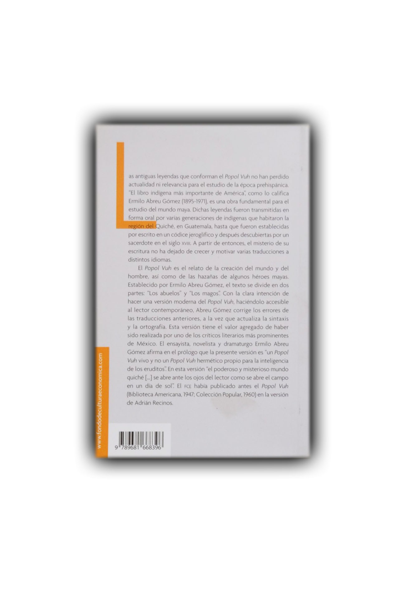 El Popol Vuh es el relato de la creación del mundo y del hombre, así como de las hazañas de algunos héroes mayas. Establecido por Ermilo Abreu Gómez, el texto se divide en dos partes, Los Abuelos y Los Magos. Con la clara intención de hacer una versión moderna del Popol Vuh, haciéndolo accesible al lector contemporáneo. Abreu Gómez corrige los errores de las traducciones anteriores, a la vez que actualiza la sintaxis y la ortografía.