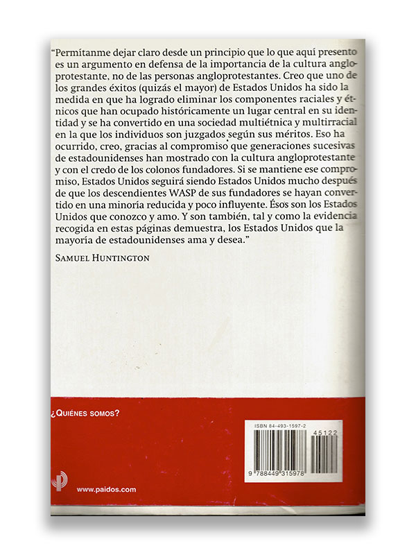 Este libro es una fascinante exploración sobre la naturaleza de la identidad cultural estadounidense, todavía en estado de shock tras los acontecimientos del 11 de septiembre de 2001. De hecho, la devoción patriótica que siguió a los atentados se plasmó, entre otras cosas, en la venta de 250.000 banderas en unos conocidos grandes almacenes a lo largo de un solo día. Pero esta súbita reivindicación de la enseña nacional era sólo la evidencia física de algo mucho más importante: el renacimiento del orgullo en gran parte del pueblo de Estados Unidos, un sentimiento que había permanecido en estado de letargo desde hacía mucho tiempo. Para algunos todo se redujo a los McDonalds, a Walt Disney y al béisbol. Para otros, la reivindicación de esos valores debía remontarse a los primeros británicos que se establecieron en aquellas tierras, a la que legaron su cultura y su lengua. Para los afroamericanos y los latinos, sin embargo, no se trató de nada de todo esto. Estados Unidos ha debido lidiar desde sus primeros días con los problemas de asimilación que supone la existencia en su territorio de culturas distintas. No obstante, hoy debe enfrentarse a una situación aún más peliaguda: la facilidad con que los inmigrantes pueden mantener los vínculos afectivos con su cultura de origen –llamadas a larga distancia, emisoras de televisión en su propio idioma, billetes de avión a muy bajo precio--, con el distanciamiento que ello supone respecto a los nuevos valores de su país de adopción. ¿Quiénes somos? es uno de los libros más importantes de los últimos tiempos, una investigación a la vez histórica y cultural que, como los trabajos previos de su autor, provocará sin duda un encendido debate político e intelectual.