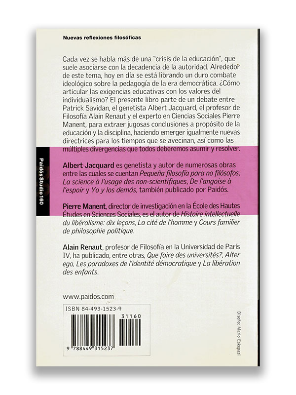 Cada vez se habla más de una “crisis de la educación”, que suele asociarse con la decadencia de la autoridad. Alrededor de este tema, hoy en día se está librando un duro combate ideológico sobre la pedagogía de la era democrática. ¿Cómo articular las exigencias educativas con los valores del individualismo? El presente libro parte de un debate entre Patrick Savidan, el genetista Albert Jacquard, el profesor de Filosofía Alain Renaut y el experto en Ciencias Sociales Pierre Manent, para extraer jugosas conclusiones a propósito de la educación y la disciplina, haciendo emerger igualmente nuevas directrices para los tiempos que se avecinan, así como las múltiples divergencias que todos deberemos asumir y resolver.