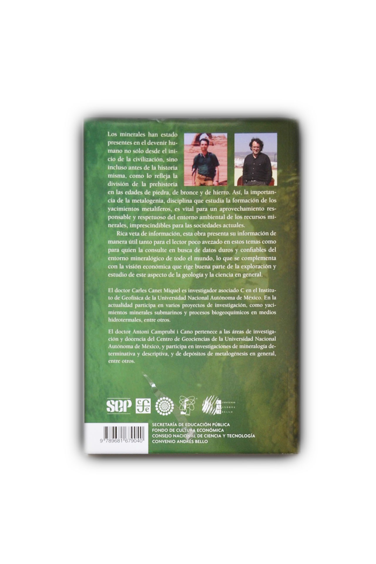 Los minerales han estado presentes en el devenir humano no solo desde el inicio de la civilización, sino incluso antes de la historia misma, como lo refleja la división de la prehis-toria en las edades de piedra, de bronce y de hierro. Así, la importancia de la metalogenia, disciplina que estudia la formación de los yacimientos metalíferos, es vital para un aprovechamiento responsable y respetuoso del entorno ambiental de los recursos minerales, imprescindibles para las sociedades actuales. Rica veta de información, esta obra presenta su información de manera útil tanto para el lector poco avezado en estos temas como para quien la consulte en busca de datos duros y confiables del entorno mineralógico de todo el mundo, lo que se complementa con la visión económica que rige buena parte de la exploración y estudio de este aspecto de la geología y la ciencia en general. Los autores parten de una perspectiva histórica y pragmática para explicar la metalogenia, disciplina que estudia la formación de los yacimientos metalíferos, con una visión que considera el carácter indispensable y, a la vez, no renovable de estos elementos en todas las sociedades modernas. La abundante información se refiere a los yacimientos en el planeta entero y abarca desde su exploración hasta su aprovechamiento, pasando por su prospección y explotación.